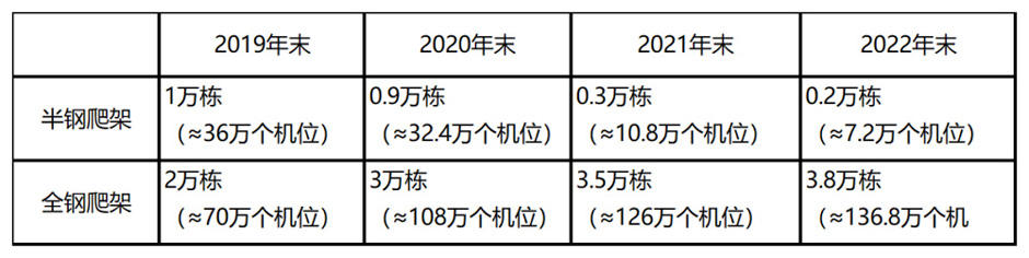 截止到2022年末,爬架市場(chǎng)機(jī)位存量整體保持在4萬(wàn)棟左右(144萬(wàn)個(gè)機(jī)位),各地政策及標(biāo)準(zhǔn)的推動(dòng)下,全鋼架快速替代半鋼架,達(dá)到136.8萬(wàn)個(gè)機(jī)位,半鋼架存量持續(xù)減少,市場(chǎng)上僅7.2萬(wàn)個(gè)機(jī)位左右,全鋼架與半鋼架存量比為19:1。2022年全鋼架增速同比下降50%左右。受鋁錠價(jià)格大幅上漲影響,鋁合金爬架機(jī)位增幅很小,總存量仍不足1萬(wàn)個(gè)機(jī)位。