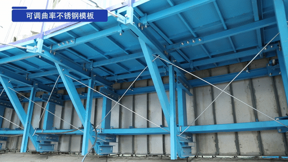 4、首次在滑模中應(yīng)用不銹鋼模板平臺創(chuàng)新性地采用可調(diào)曲率高強(qiáng)不銹鋼模板體系替代傳統(tǒng)小鋼模板,改變“以直代曲”的施工工藝,同時(shí)可實(shí)現(xiàn)弧形不銹鋼模板地高效周轉(zhuǎn)。